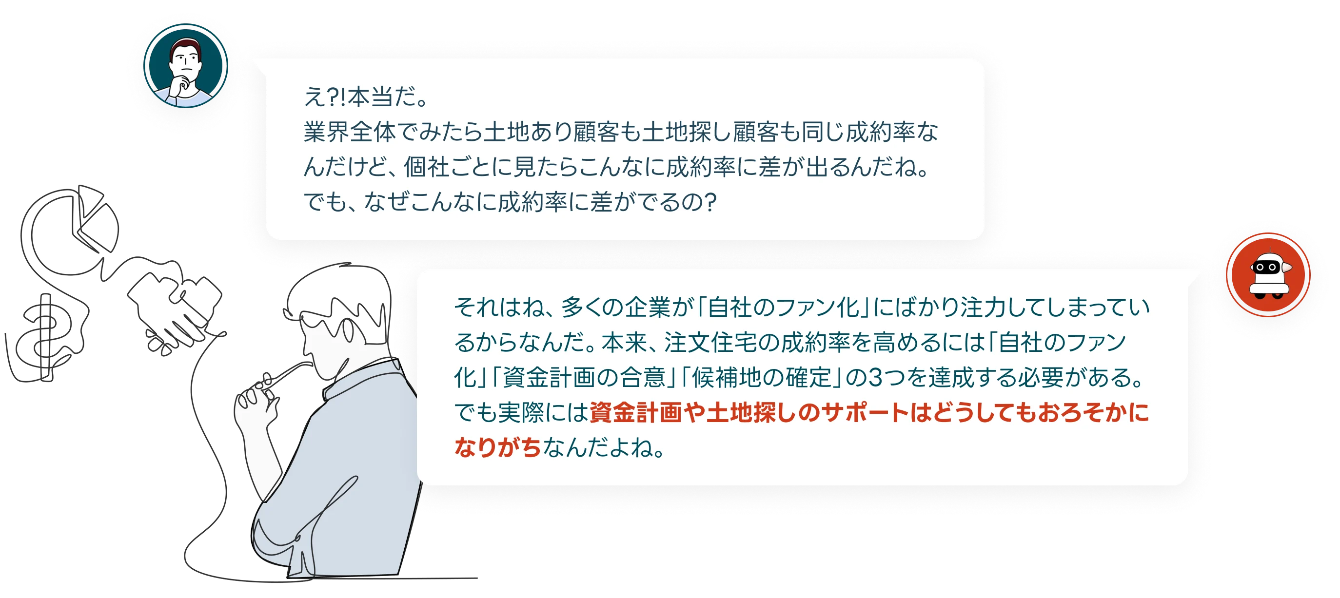 もし『土地探し顧客は決まりにくい』と感じている場合、それは土地探しが得意なハウスメーカーがうまく対応して、本来御社で成約になるはずだった顧客と契約しているということです。