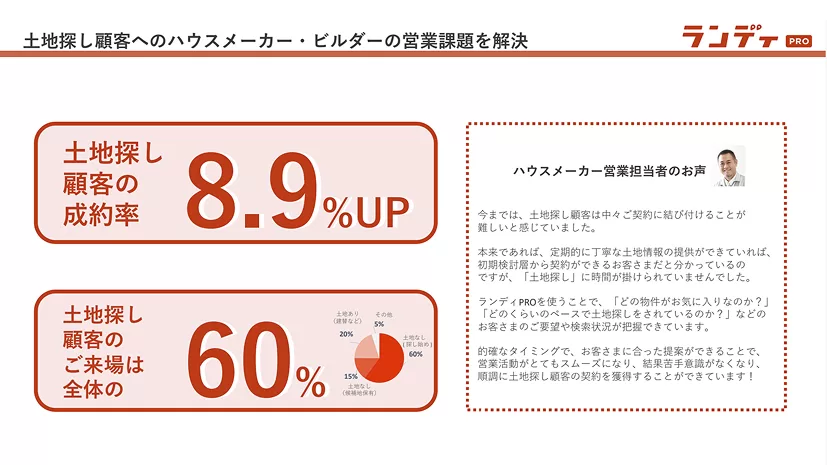 ランディPROは、大手ハウスメーカーから地域密着型の工務店まで、幅広い企業様にご導入いただいている”土地探し顧客の接客・追客支援システム” です。 本資料では、サービス概要を紹介しています。