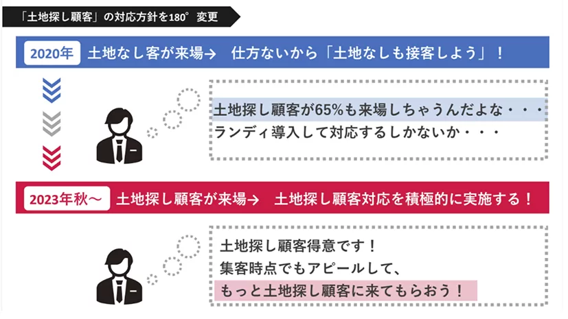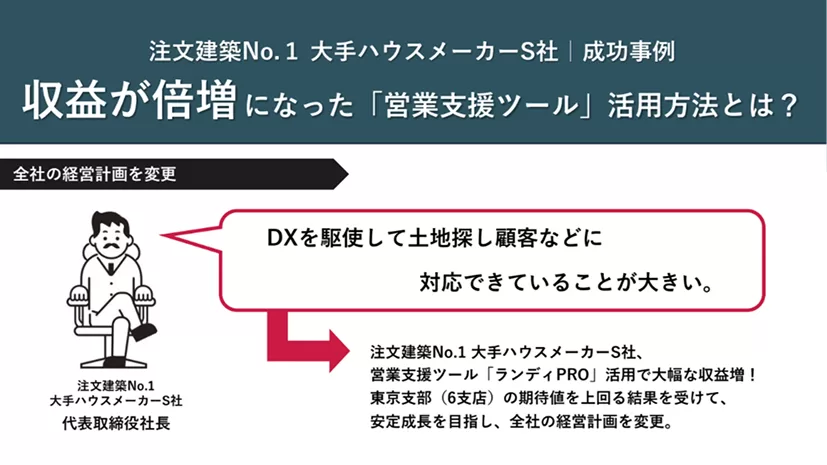 受注棟数を増やす上で、来場の7割以上を占めると言われいている「土地探し顧客」を成約に導く対応は不可欠となっています。 本資料では、"今すぐ客"ではないと思っていた「土地探し顧客」への接客・追客において、ランディPROを使って収益を倍増にさせた事例を紹介しています。