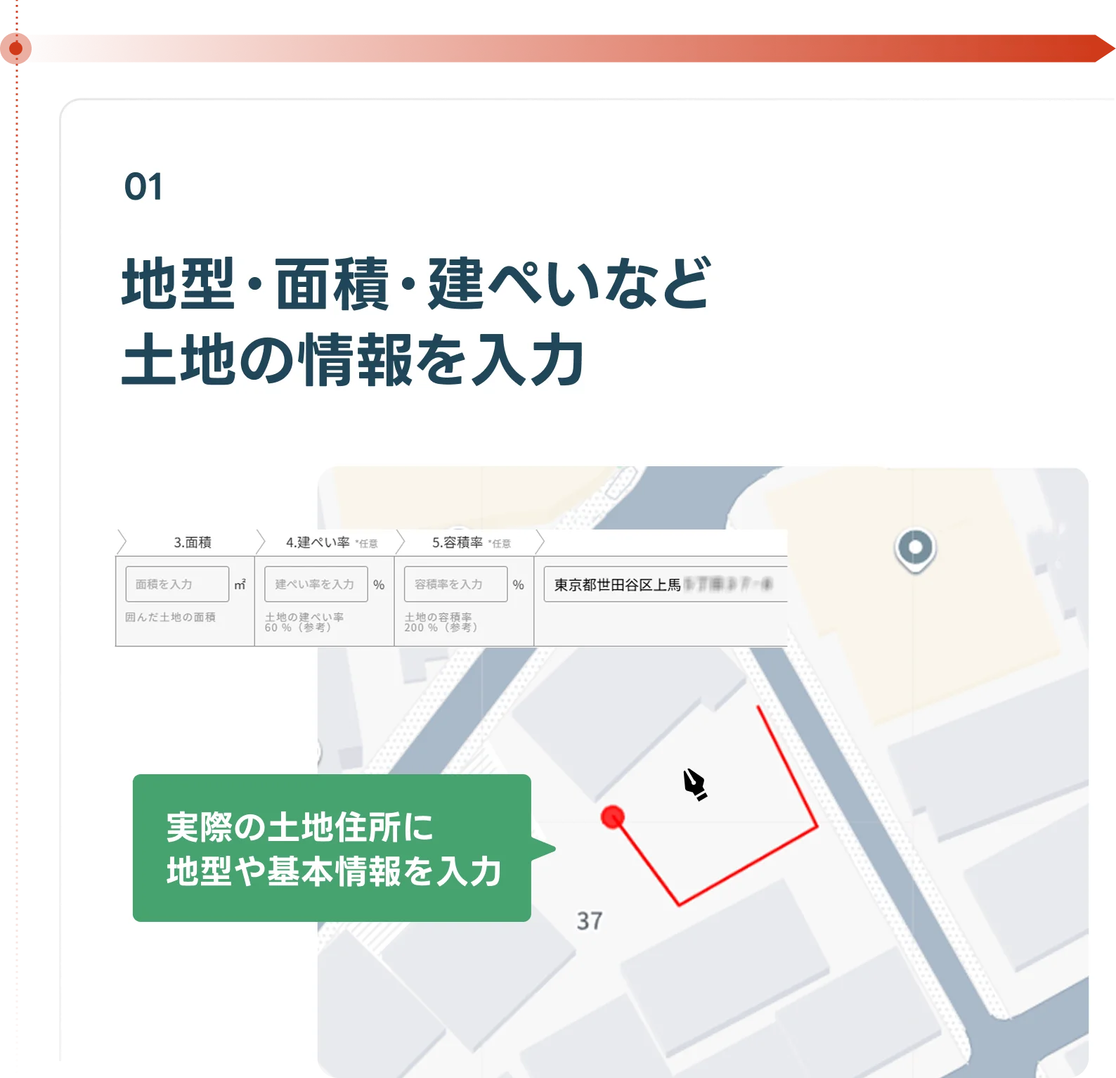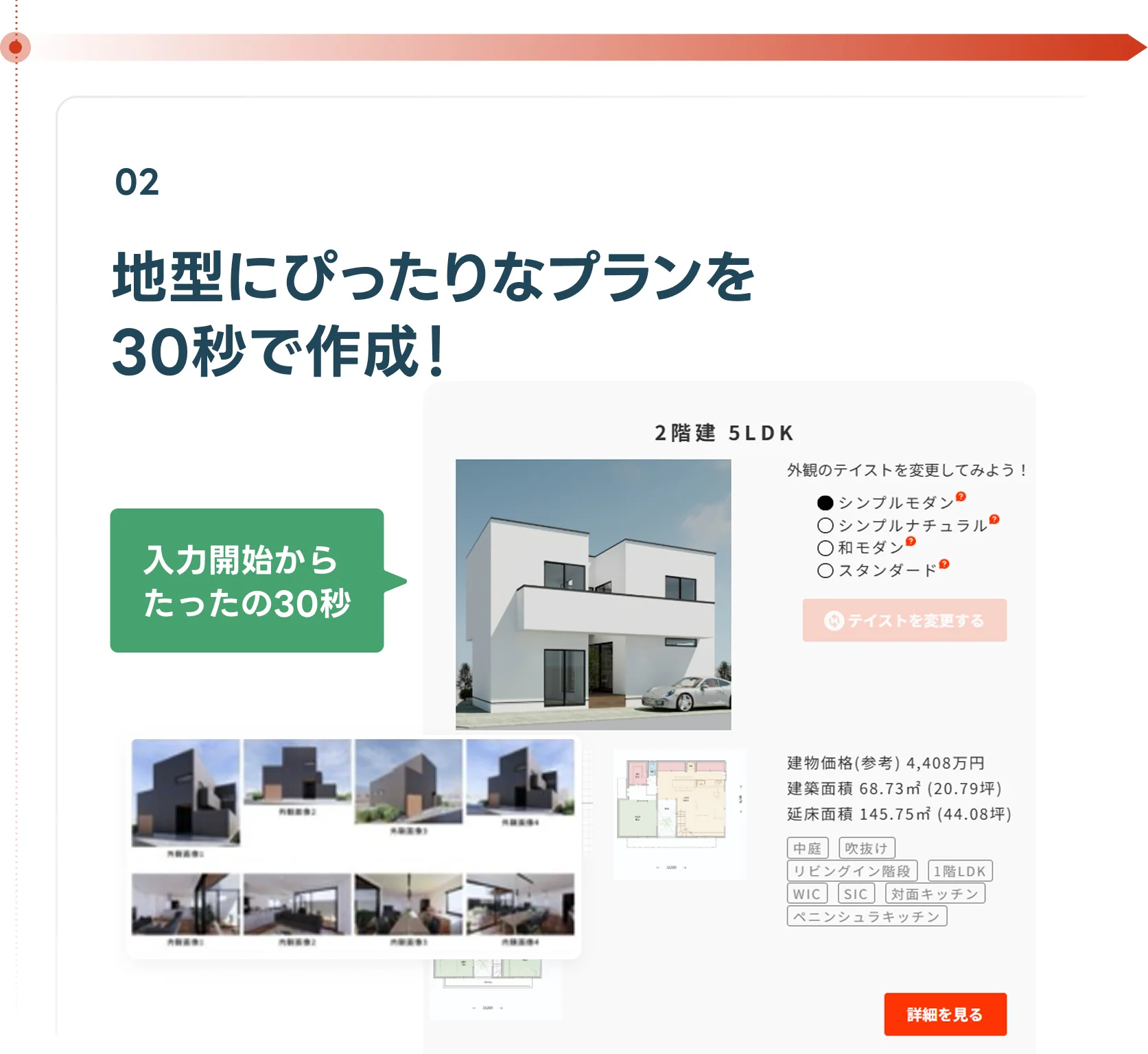複雑な現地調査や測量作業は不要。土地の基本情報を入力するだけで、お客様の目の前で魅力的なプランを複数提示。