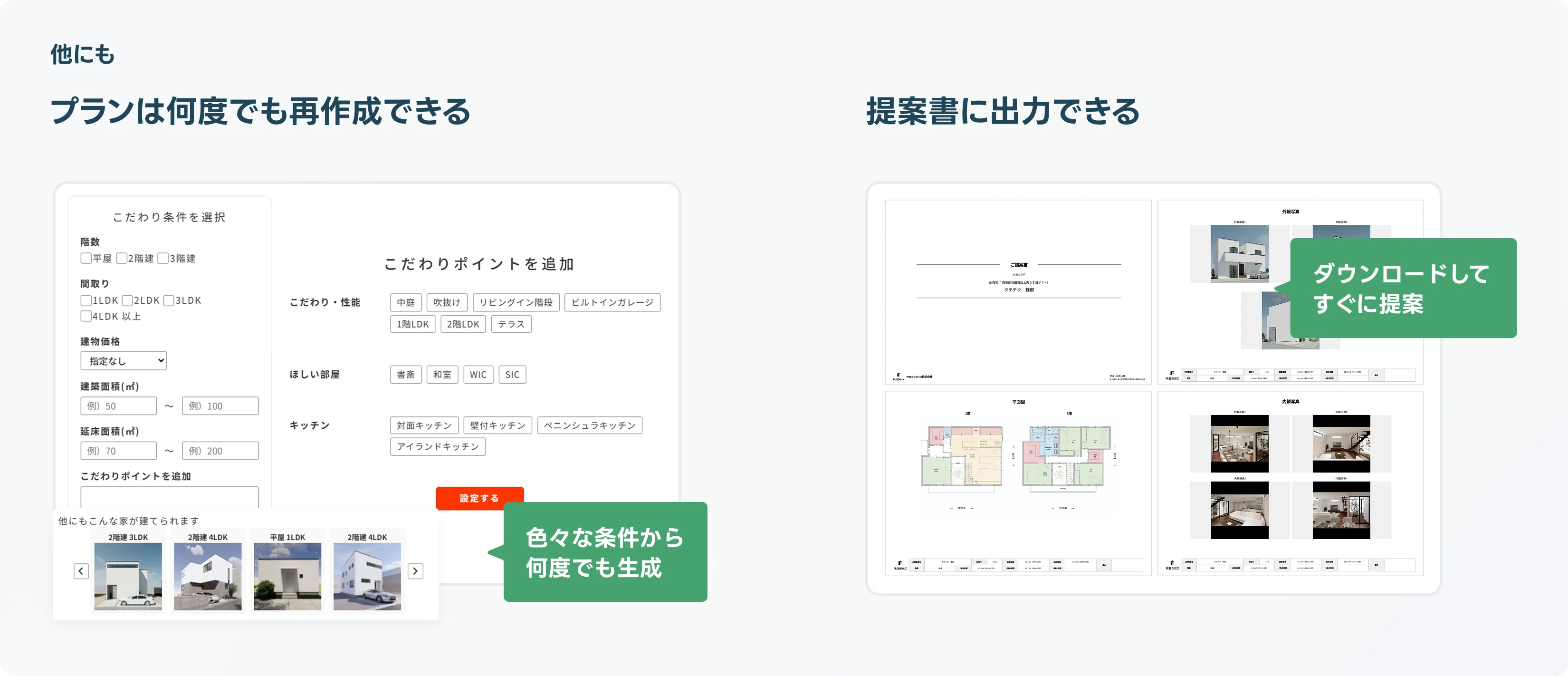 従来の手法では時間のかかるプラン作成が、わずか30秒で完了します。また、条件や外観のテイスト変更で何度でも再作成でき、作成したプランをダウンロードすぐにその場で提案することが可能になります。