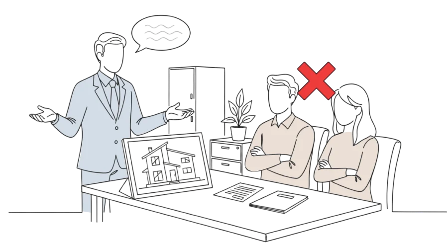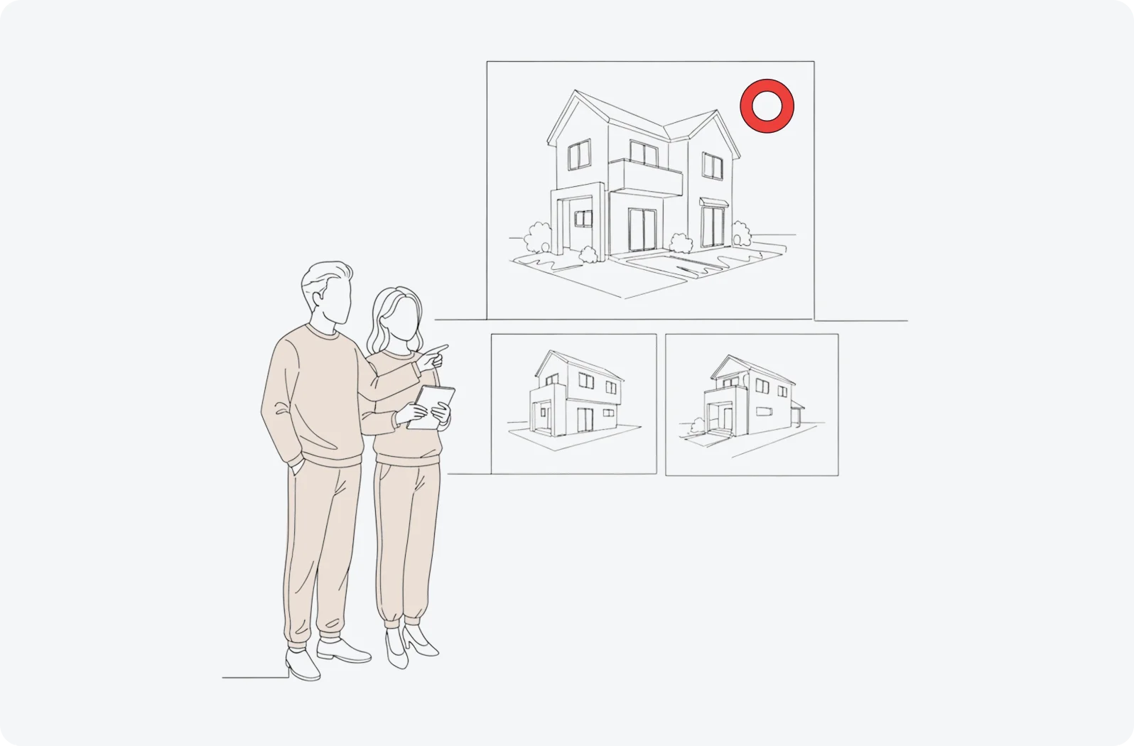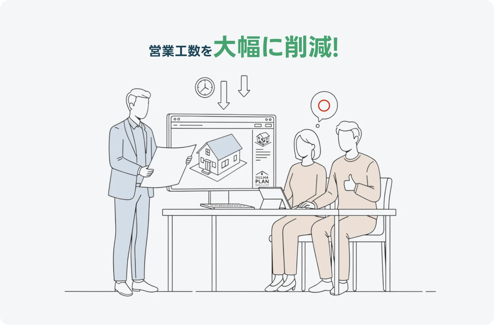 「せっかくモデルハウスに行ったのにプラン書いてもらえない」「プラン提案まで時間がかかる」といった顧客の悩みを解決。 設計士の工数を使わずとも、営業担当者が簡単に複数のプランをその場で生成・提案できるため、お客様の期待にスピーディーに応えられます。 スピーディーな対応が、競合との差別化につながり、最終候補に選ばれる大きな一歩となります。さらに、いち早くプランを現実できることで商談の主導権を握りやすくなり、成約へとつながる確率も高まります。