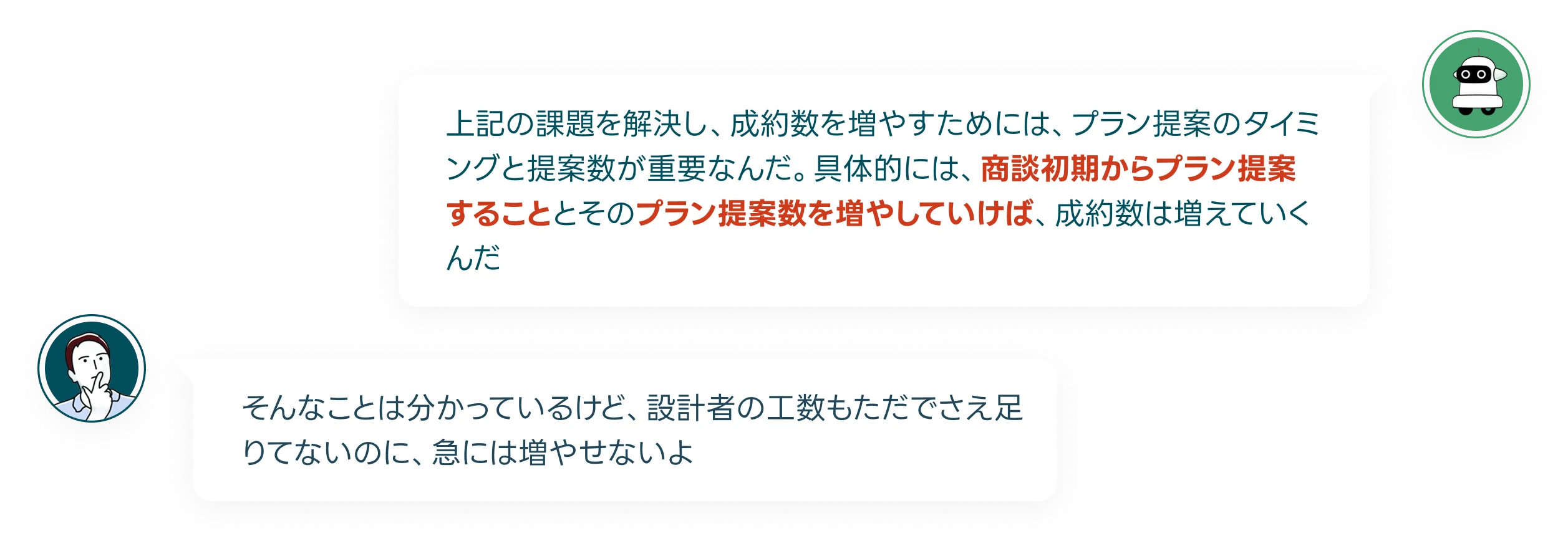 「要望がなかなか反映されてない」という顧客の不満を解消。プラン提案時にテイストの異なる複数のプランを生成し提示することで、顧客とのイメージの相違を防ぎ、顧客の好みを具体的に把握できます。これにより、本プラン提案ではズレのない満足度の高いプランを効率的にご提案でき、最終候補企業として選ばれやすくなります。