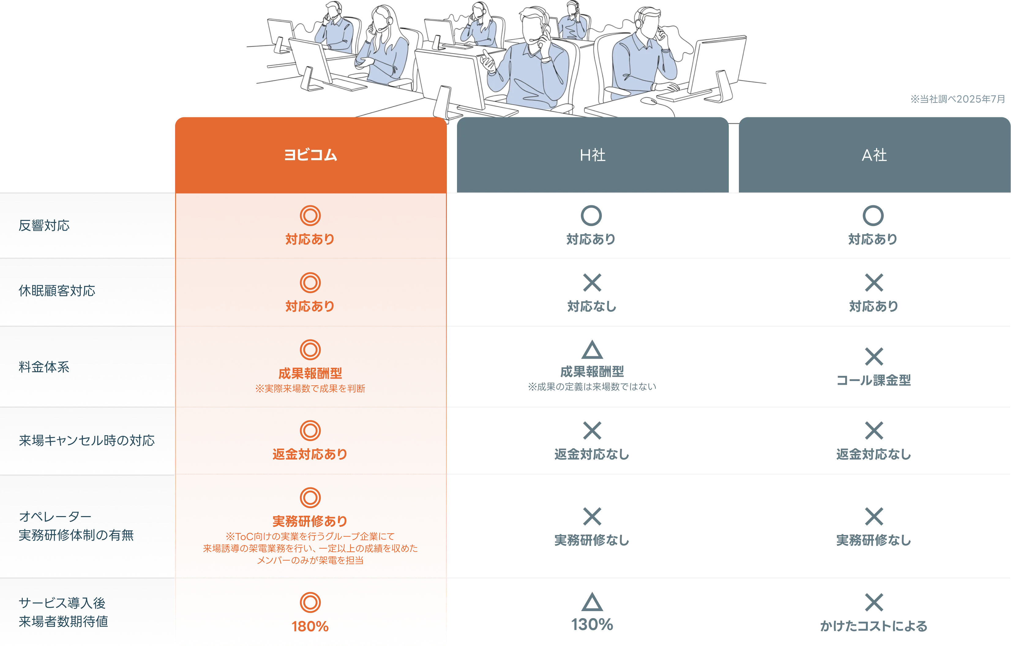 ヨビコムはToC向けの実業を行うグループ会社にて、一定期間以上の来場誘導のテレアポ業務を経験させた中から、一定以上のアポイント獲得率を取ったオペレーターのみを厳選し、運営しています。