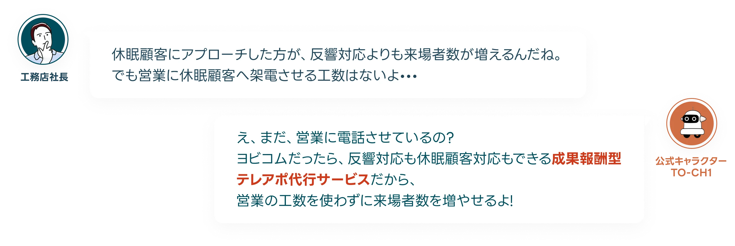 過去に問い合わせに対し追客ができていない顧客等に対し、ヨビコムが貴社に代わってフォローアップを行います。