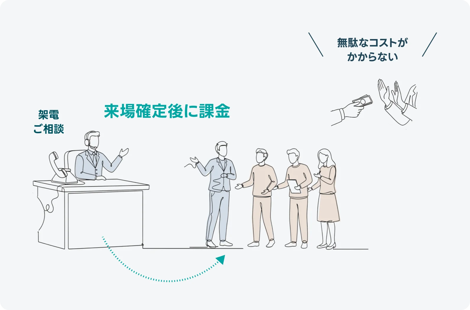 通常の集客サービスでは「アポ取得」や「架電対応」の時点で費用が発生してしまうケースも多く、成果が伴わないままコストだけが先行するリスクがあります。ヨビコムは“顧客が来場した時点”での課金対象となるため、ムダなコストをかけずに、ローリスクで始めることができます。